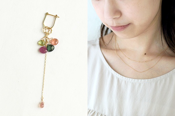 耳元の色を引き立たすために首元はチャームをつけずシンプルで光を集めるチェーンとデザインチェーンを合わせて。